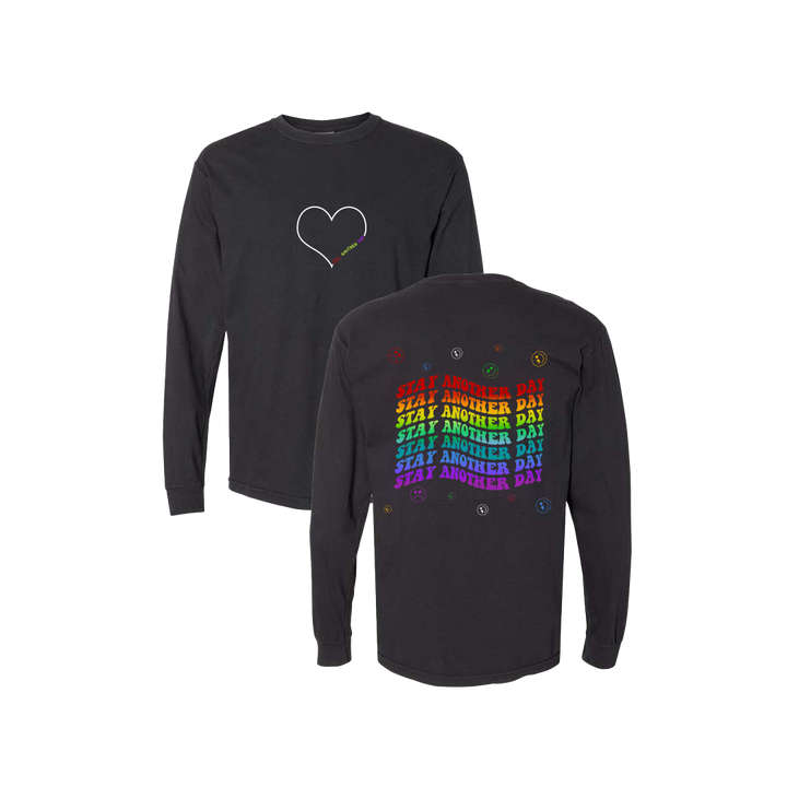Stay Another Day Rainbow Print Black T-shirt screen printed design. This super comfortable Long Sleeve Tee features a smaller white heart with rainbow Stay Another Day text on the front with the Stay Another Day text below, as well as the larger Stay Another Day Layered Rainbow Colored Print on the back.