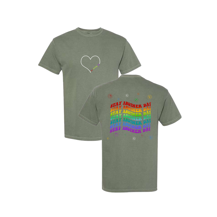Stay Another Day Rainbow Print Army Green T-shirt screen printed design. This super comfortable T-shirt features a smaller white heart with rainbow Stay Another Day text on the front with the Stay Another Day text below, as well as the larger Stay Another Day Layered Rainbow Colored Print on the back.