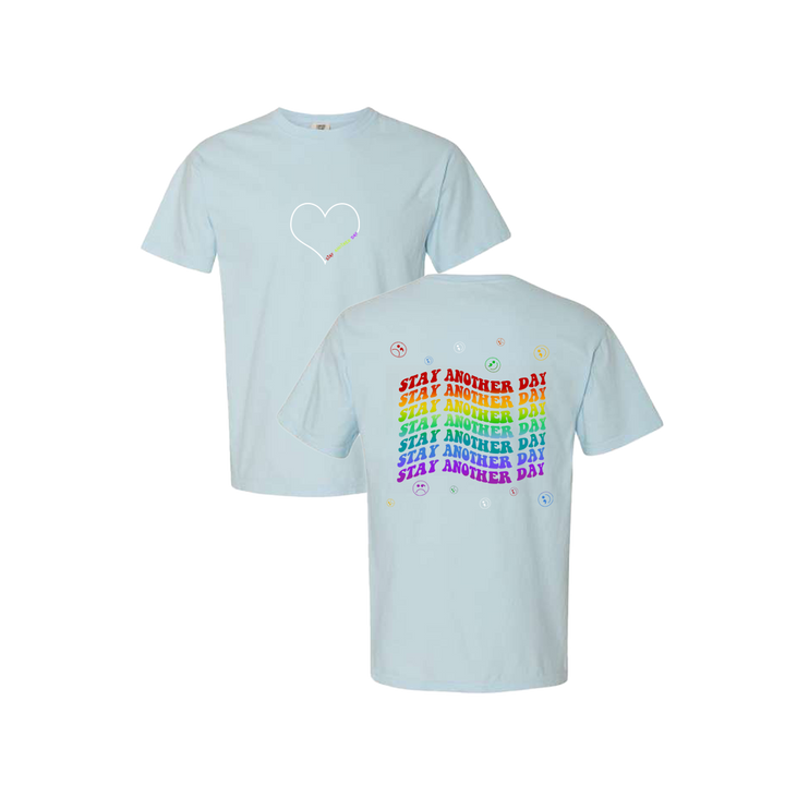 Stay Another Day Rainbow Print Blue T-shirt screen printed design. This super comfortable T-shirt features a smaller white heart with rainbow Stay Another Day text on the front with the Stay Another Day text below, as well as the larger Stay Another Day Layered Rainbow Colored Print on the back.