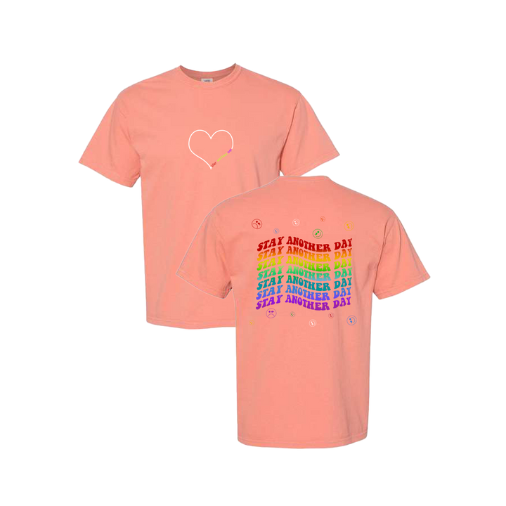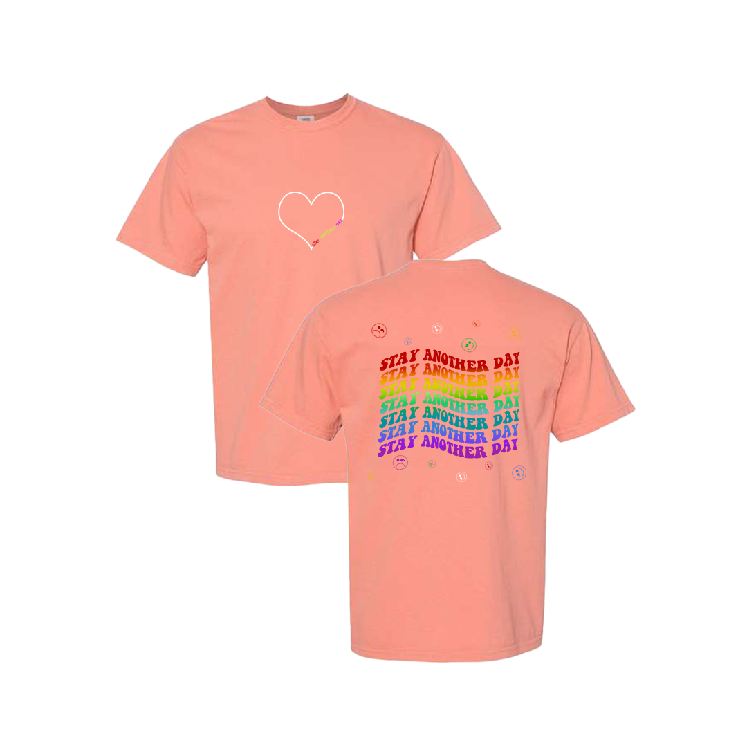 Stay Another Day Rainbow Print Coral T-shirt screen printed design. This super comfortable T-shirt features a smaller white heart with rainbow Stay Another Day text on the front with the Stay Another Day text below, as well as the larger Stay Another Day Layered Rainbow Colored Print on the back.