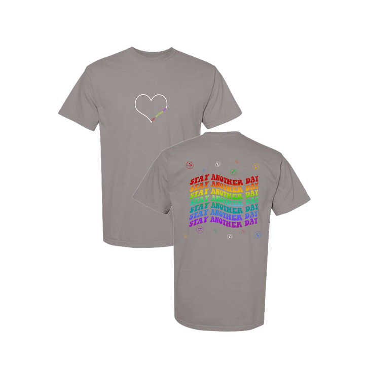 Stay Another Day Rainbow Print Grey T-shirt screen printed design. This super comfortable T-shirt features a smaller white heart with rainbow Stay Another Day text on the front with the Stay Another Day text below, as well as the larger Stay Another Day Layered Rainbow Colored Print on the back.