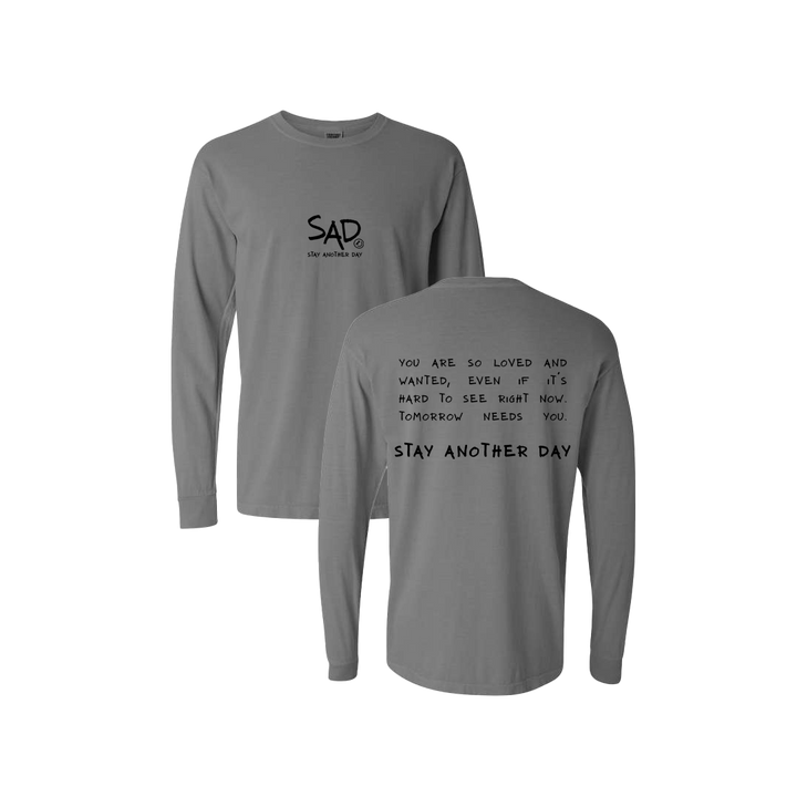 Letter to Person Behind You screen printed Grey Long Sleeve Tee. This super comfortable Long Sleeve Tee features the small SAD logo on the front with the Stay Another Day text below, as well as the larger Letter print on the back.
