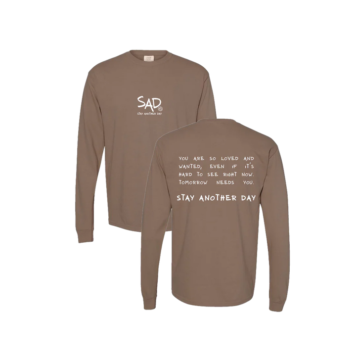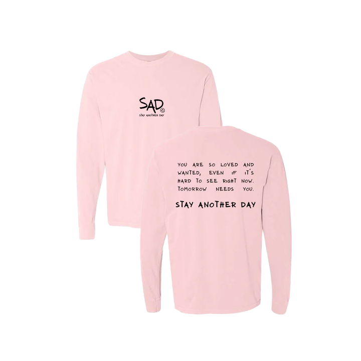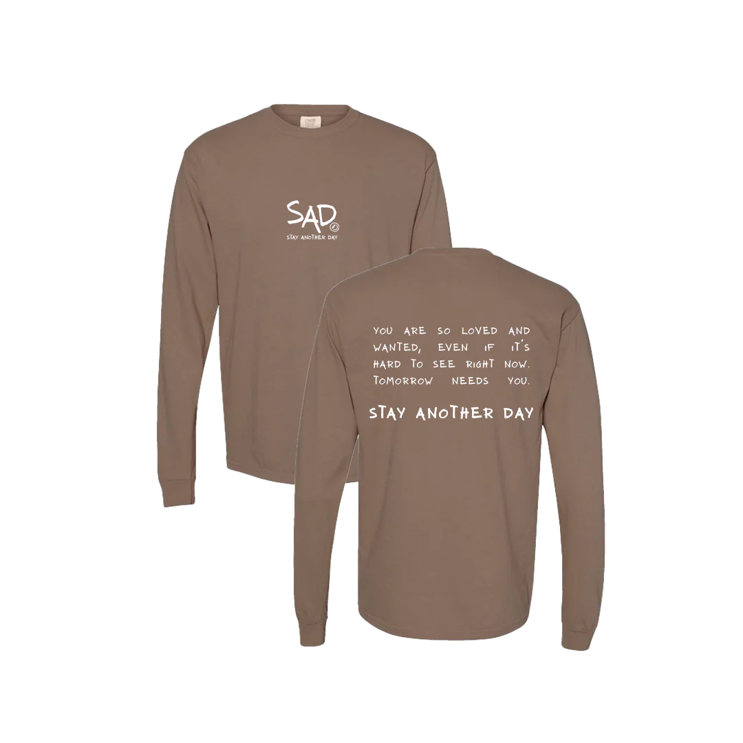 Letter to Person Behind You screen printed Long Sleeve Tee. This super comfortable Long Sleeve Tee features the small SAD logo on the front with the Stay Another Day text below, as well as the larger Letter print on the back