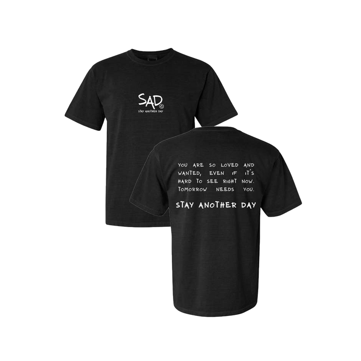 Letter to Person Behind You screen printed Black T-shirt. This super comfortable T-shirt features the small SAD logo on the front with the Stay Another Day text below, as well as the larger Letter print on the back.