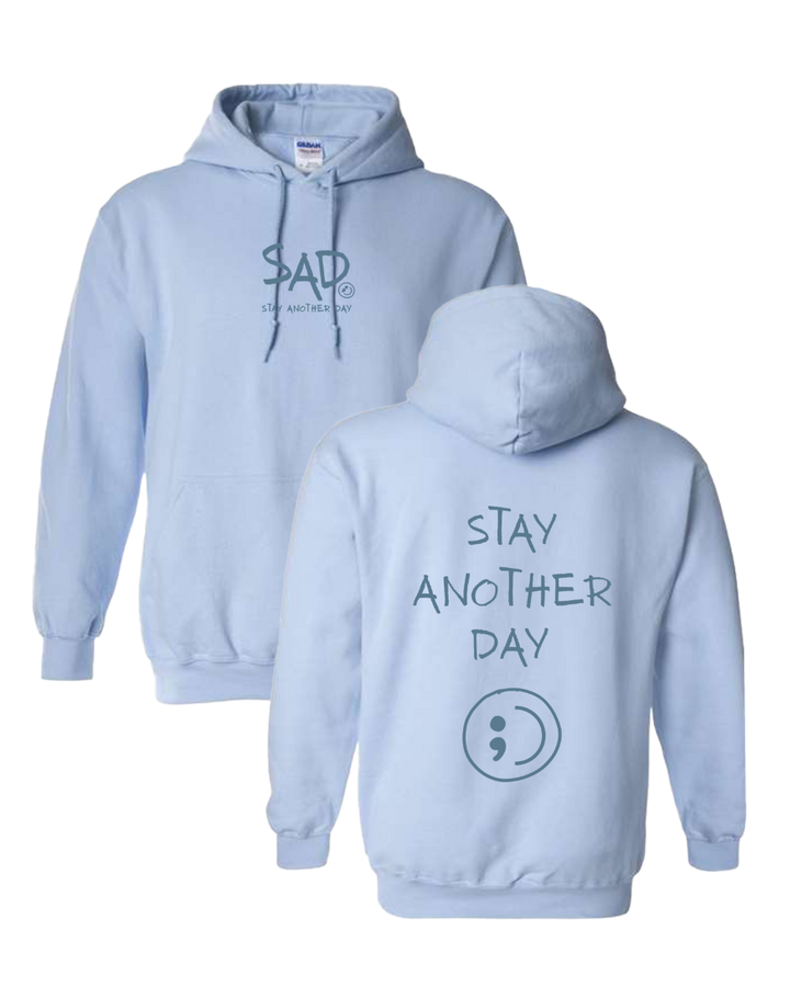 Stay Another Day hoodie featuring our original monochromatic screen-printed design. This super comfortable hoodie features the small SAD logo on the front with matching tonal Stay Another Day text below, along with a larger monochromatic Stay Another Day logo with smiley print on the back.