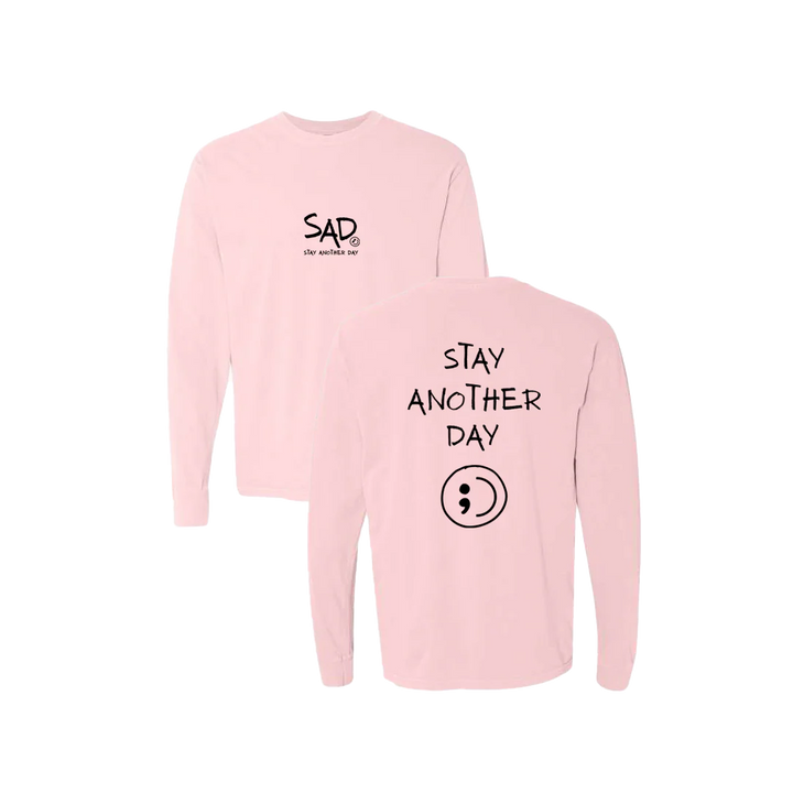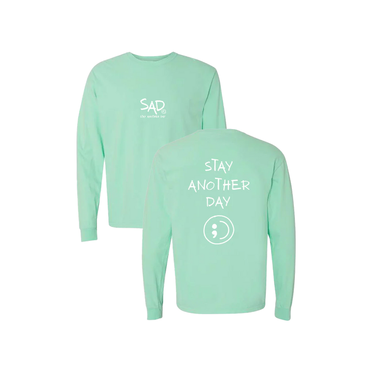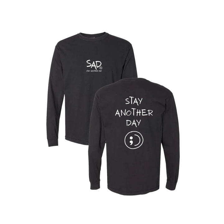Stay Another Day Long Sleeve tee featuring our original screen printed design. This super comfortable Long Sleeve Tee features the small SAD logo on the front with the Stay Another Day text below, as well as the larger Stay Another Day Logo with Smiley print on the back.