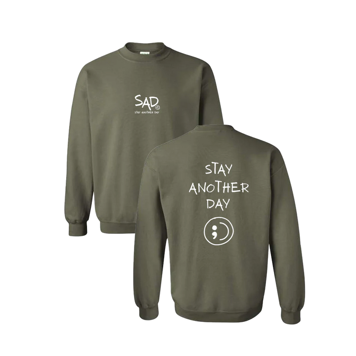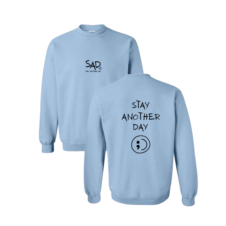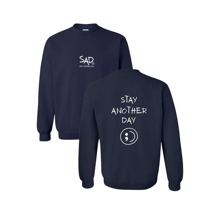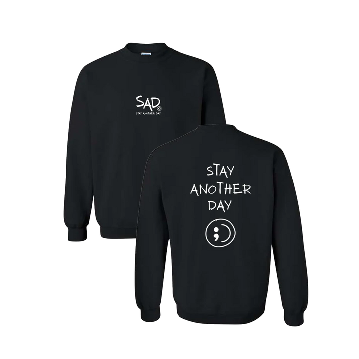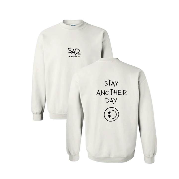 Stay Another Day crewneck featuring our original screen printed design. This super comfortable Crewneck features the small SAD logo on the front with the Stay Another Day text below, as well as the larger Stay Another Day Logo with Smiley print on the back.