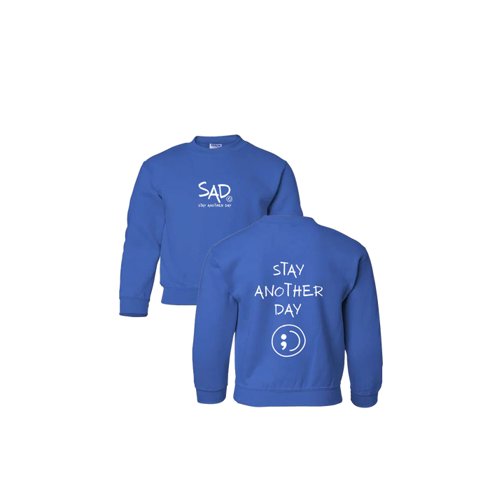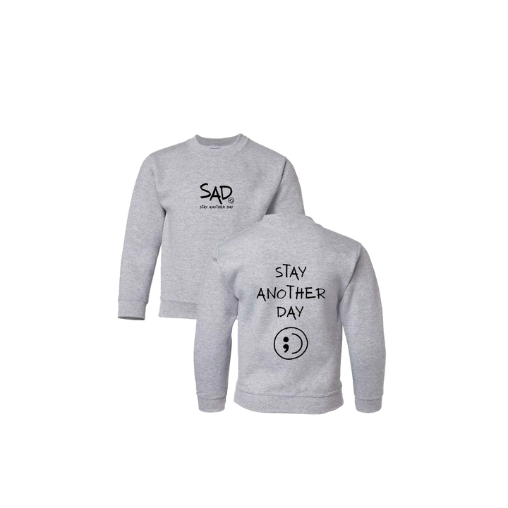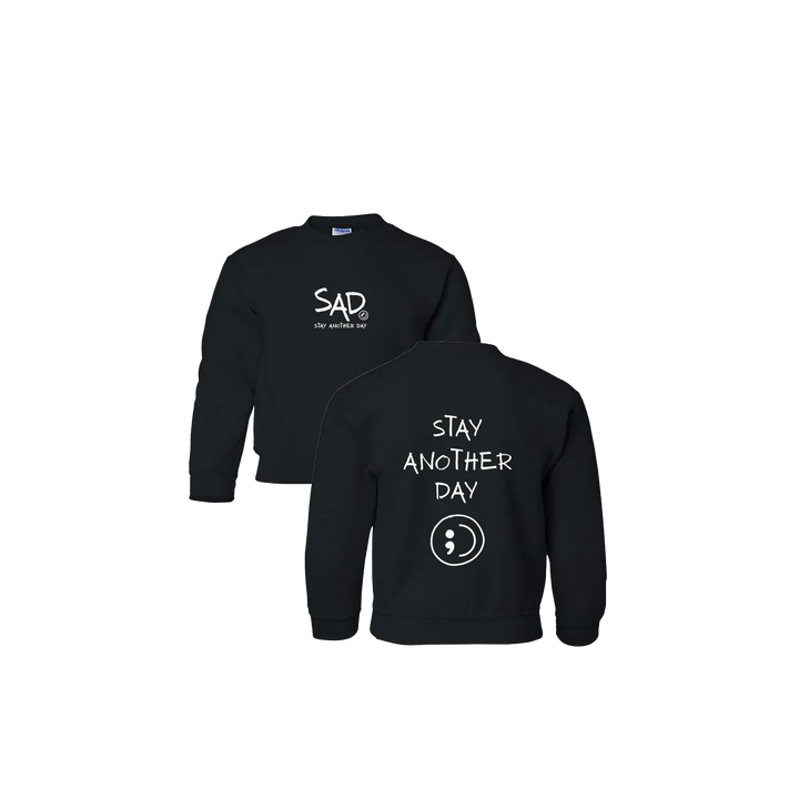 Stay Another Day youth Crewneck featuring our original screen printed design. This super comfortable Crewneck features the small SAD logo on the front with the Stay Another Day text below, as well as the Youth Larger Stay Anohter Day Logo with Smiley print on the back.