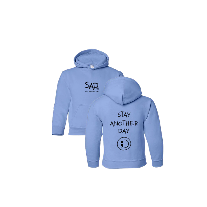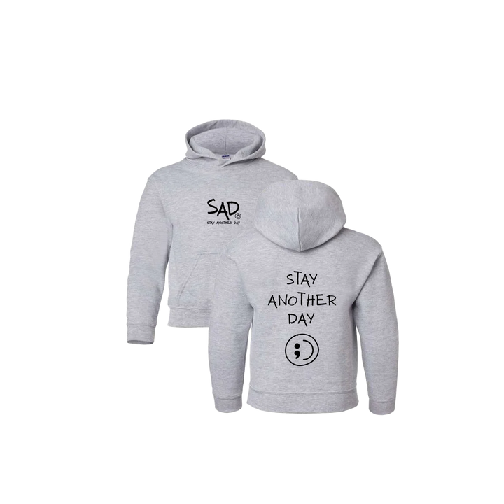 Stay Another Day youth hoodie featuring our original screen printed design. This super comfortable hoodie features the small SAD logo on the front with the Stay Another Day text below, as well as the Youth Larger Stay Another Day Logo with Smiley print on the back