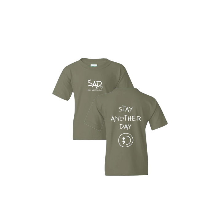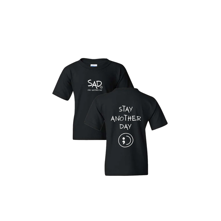 Stay Another Day Youth T-Shirt featuring our original screen printed design. This super comfortable T-shirt features the small SAD logo on the front with the Stay Another Day text below, as well as the Youth Larger Stay Another Day Logo with Smiley print on the back.