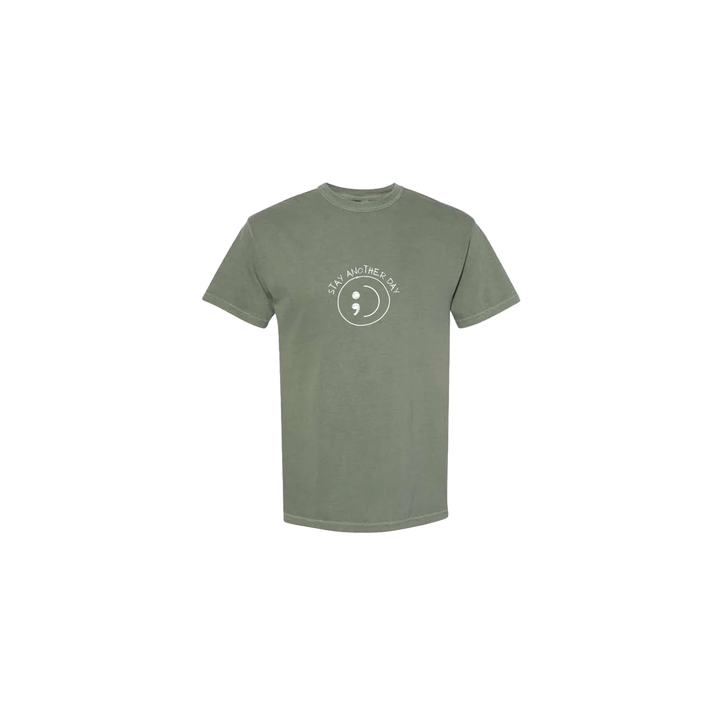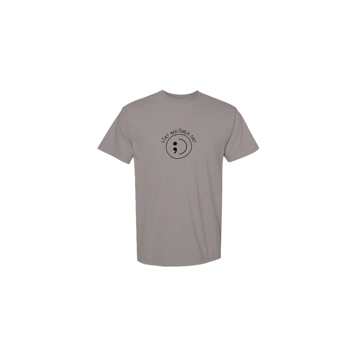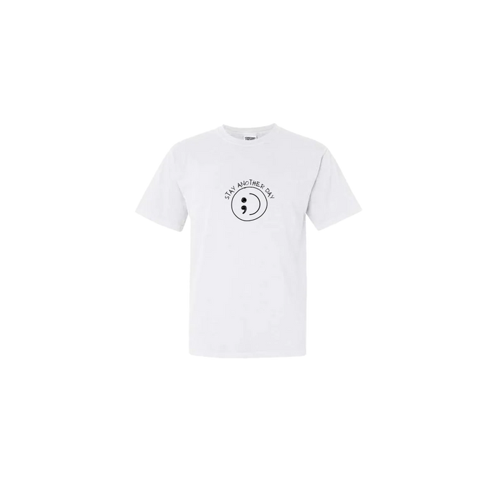 Stay Another Day Smiley Face Embroidered on a T-shirt. This super comfortable T-shirt features the Stay Another Day Smiley Face design, centered on the front chest.