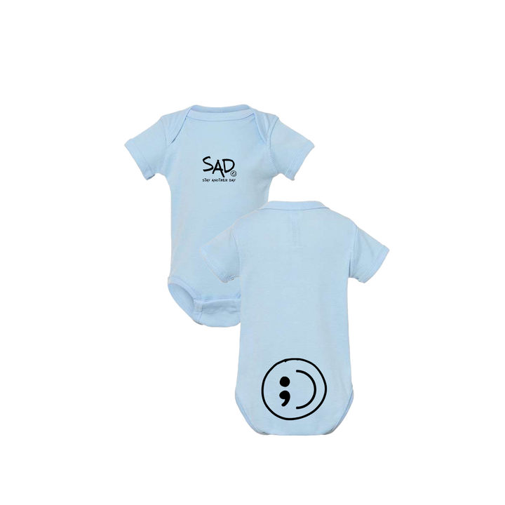Stay Another Day Blue Infant Onesie. This super comfortable Onesie features the SAD logo on the front with a Stay Another Day Smiley on the bottom.