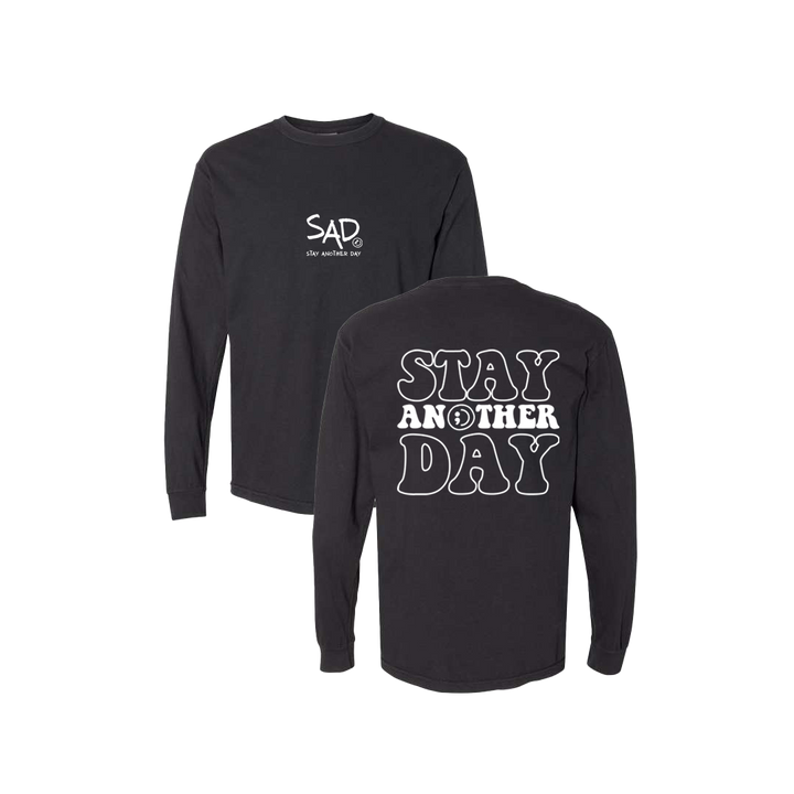 Stay Another Day Bubble Print Black T-shirt screen printed design. This super comfortable Long Sleeve Tee features the small SAD logo on the front with the Stay Another Day text below, as well as the larger Stay Another Day Bubble Print text on the back.