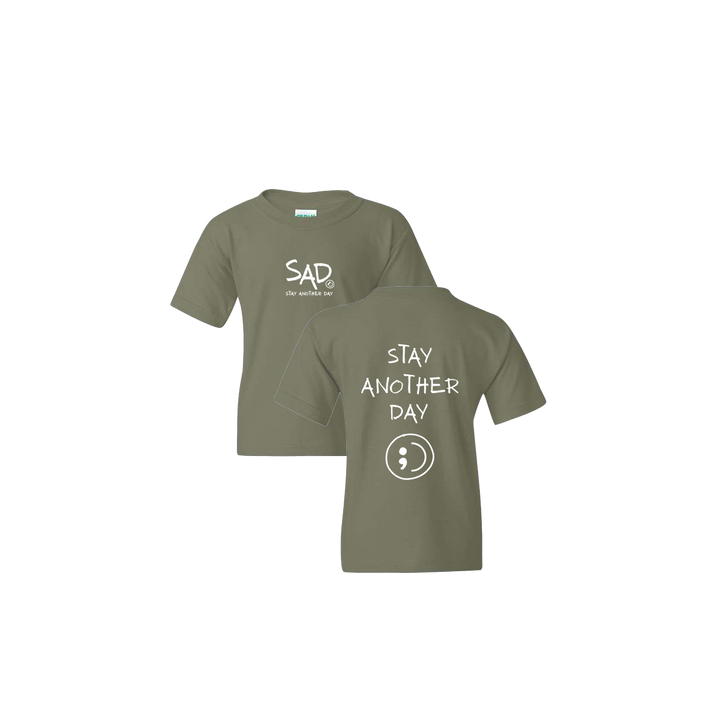 Stay Another Day Military Green youth Tshirt featuring our original screen printed design. This super comfortable Tshirt features the small SAD logo on the front with the Stay Another Day text below, as well as the Youth Larger Stay Anohter Day Logo with Smiley print on the back.
