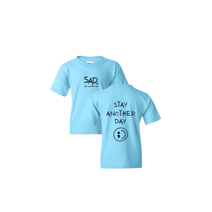 Stay Another Day Sky Blue youth Tshirt featuring our original screen printed design. This super comfortable Tshirt features the small SAD logo on the front with the Stay Another Day text below, as well as the Youth Larger Stay Anohter Day Logo with Smiley print on the back.