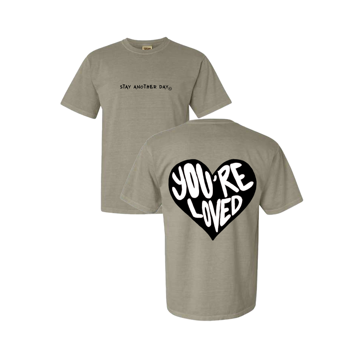 You're Loved Black Heart Design on a T-Shirt, featuring the Stay Another Day text with smiley on the front, and the Larger Black Heart on the back.