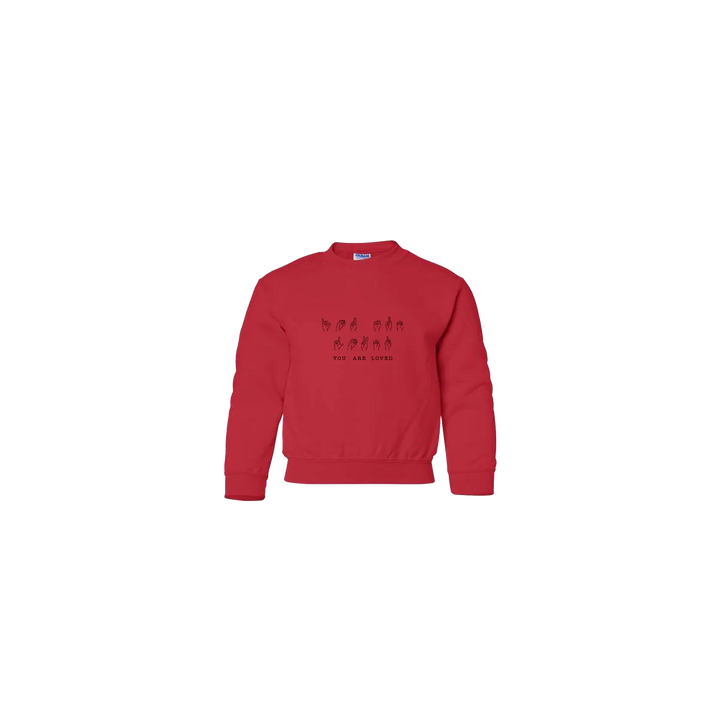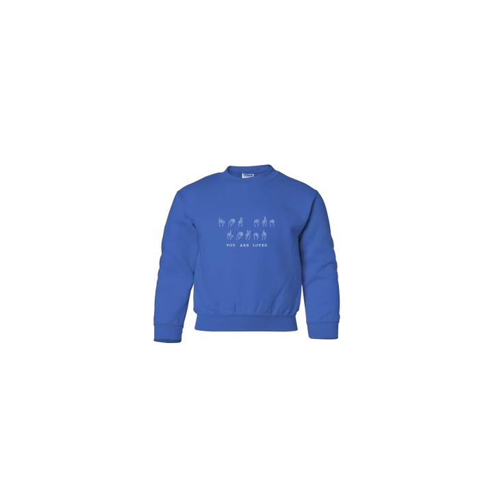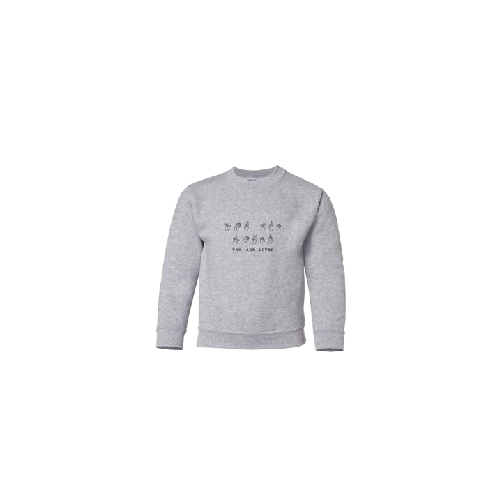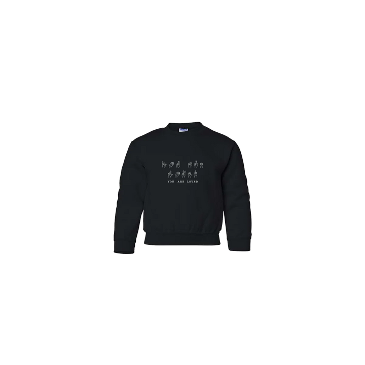 You Are Loved Sign Language Embroidered on a youth Crewneck. This super comfortable Crewneck features the signed message, "You Are Loved" hands as well text, centered on the front chest.