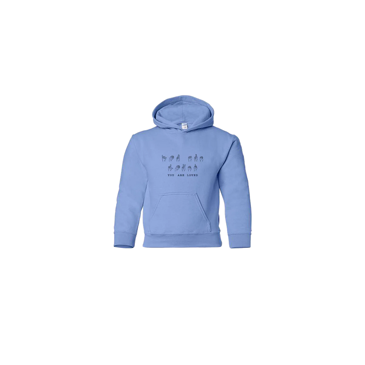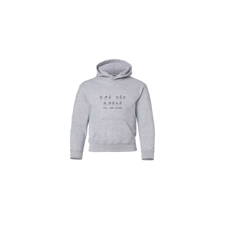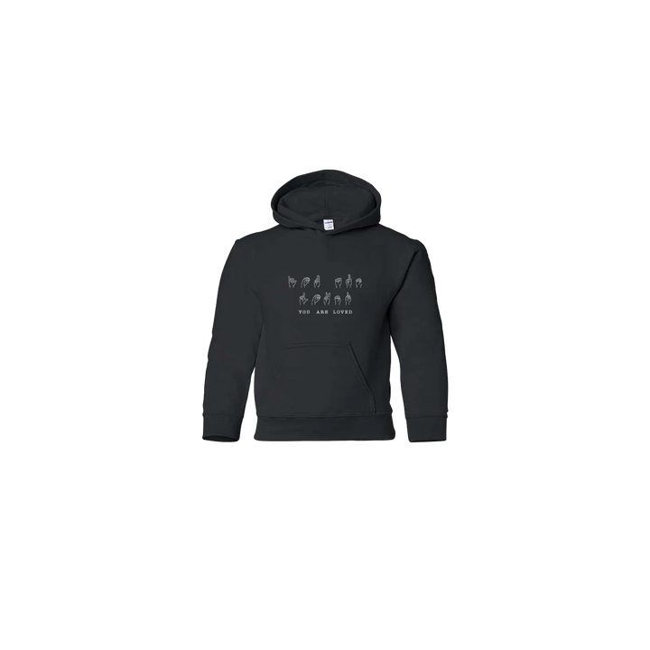 You Are Loved Sign Language Embroidered on a youth hoodie. This super comfortable hoodie features the signed message, "You Are Loved" hands as well text, centered on the front chest.