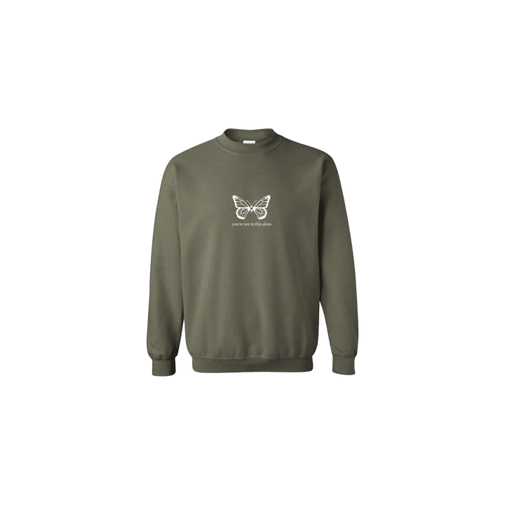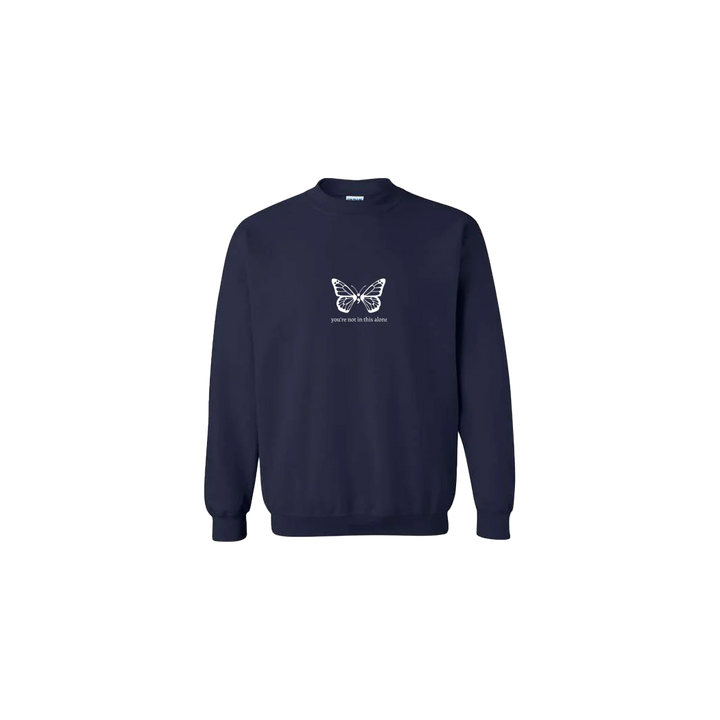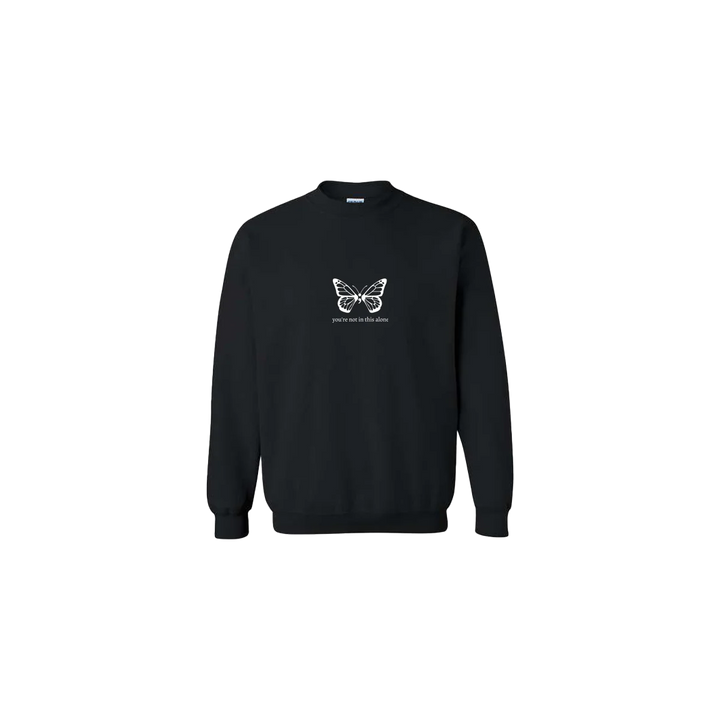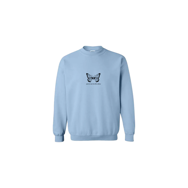You're Not In This Alone Butterfly Embroidered on a Crewneck. This super comfortable Crewneck features a Butterfly with You're Not In This Alone text, centered on the front chest.
