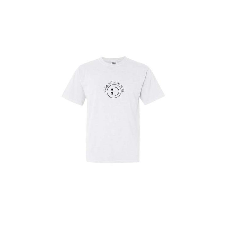 You're Not In This Alone Smiley Embroidered on a White Tshirt. This super comfortable Tshirt features the You're Not In This Alone Smiley Face Design, centered on the front chest.